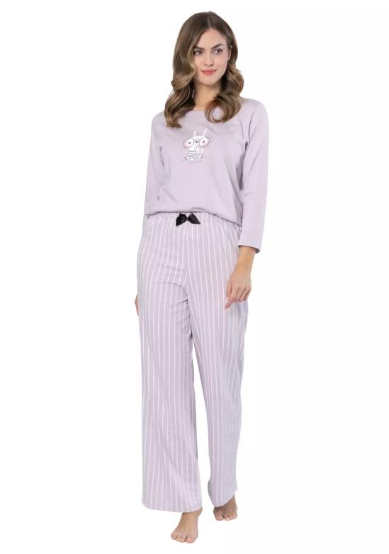 Dámské pyžamo Jana 1611 značky LEVEZA přináší spojení elegance a pohodlí, které oceníte při každém večeru i lenošení doma. Horní díl v jemném odstínu levandule s dlouhými rukávy a hravým obrázkovým potiskem vytváří příjemnou atmosféru pro chvíle odpočinku. Kalhoty ve fialové barvě s decentními bílými proužky doplňuje elastický pas s černou mašličkou, která podtrhuje ženský styl. Celý komplet je ušit z vysoce kvalitní bavlny, která je měkká na dotek a zajišťuje maximální komfort během spánku i relaxace. ...
