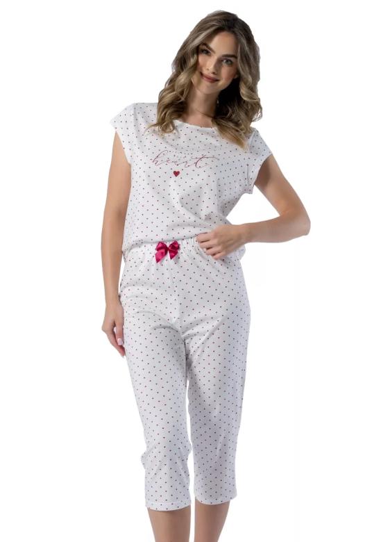 Dámské pyžamo Kaja 1550 značky LEVEZA je ideální volbou pro každou ženu, která hledá kombinaci pohodlí a stylu. Tento elegantní set se skládá z bílé halenky s drobnými červenými puntíky a nápisem „heart“ doplněným červeným srdíčkem, který dodává nádech ženskosti a hravosti. Capri kalhoty s malými srdíčky končí pod koleny a mají elastický pas, ozdobený jemnou růžovou mašličkou, jež přidává šarm a půvab. Díky volnému střihu a příjemnému materiálu se pyžamo skvěle hodí pro chvíle odpočinku doma. Pro výrobu...