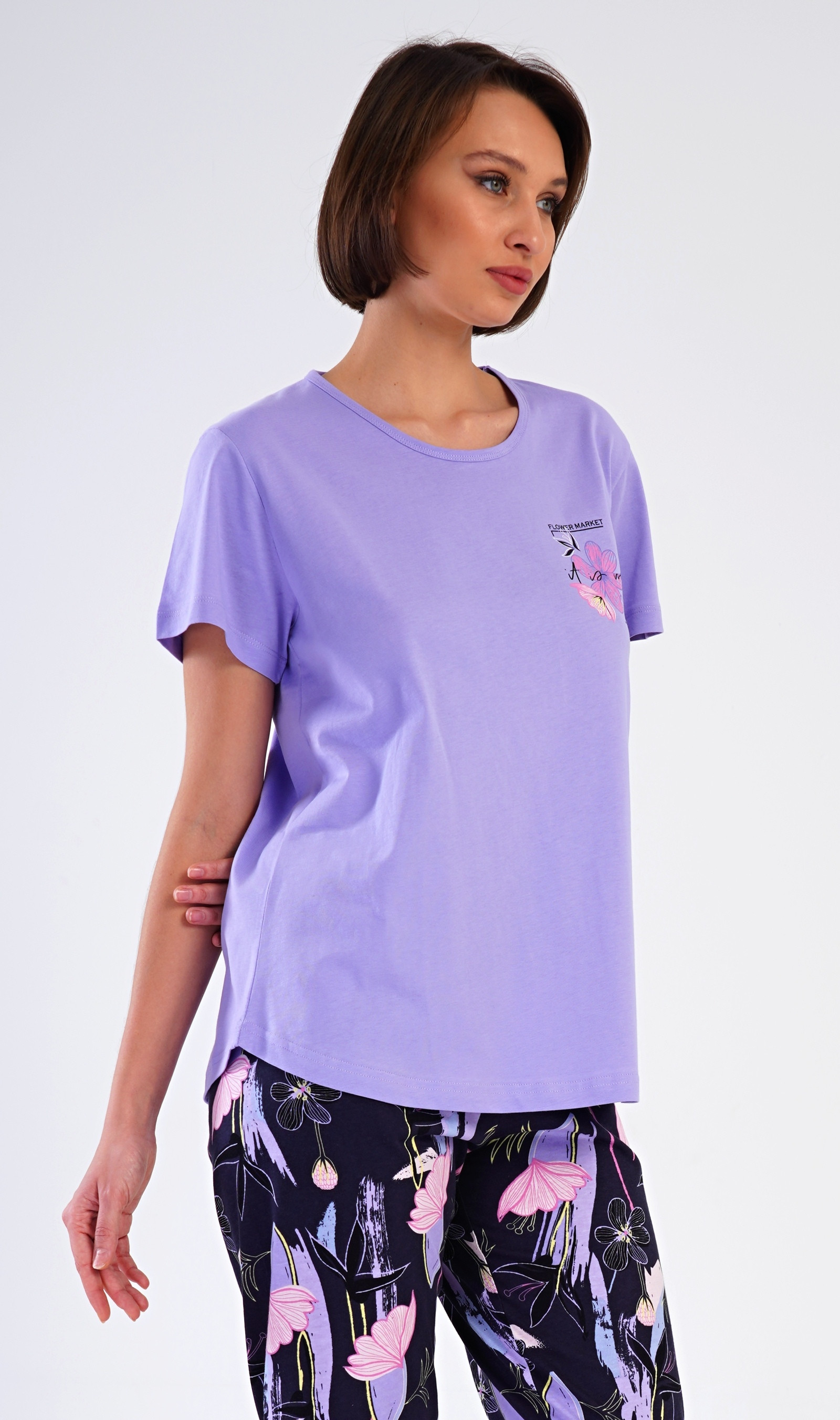 Dámské bavlněné kapri pyžamo značky Vienetta Secret. Dámské pyžamo se skládá z trička s krátkým rukávem a tříčtvrtečních kalhot. Tričko s kulatým výstřihem má na hrudi obrázek květu. Tento motiv se opakuje i na kalhotách, které mají v pase gumu a šňůrku na stažení, jsou bez kapes. Použitý bavlněný materiál je příjemný a poddajný na dotek.