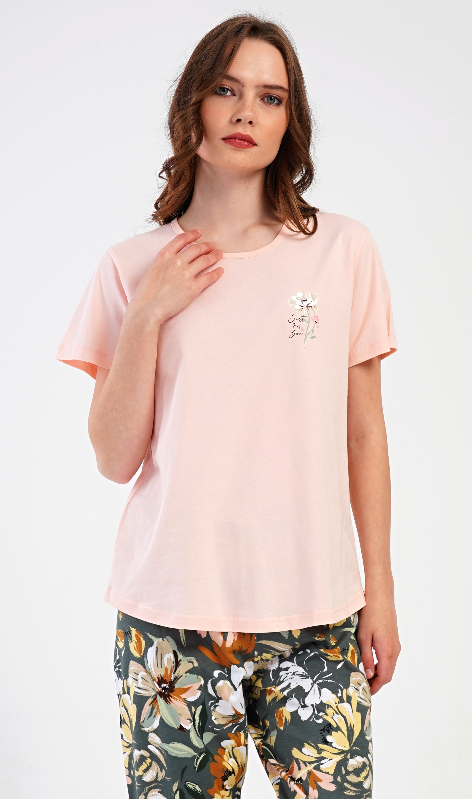 Dámské bavlněné kapri pyžamo Vienetta Secret. Dámské pyžamo se skládá z trička s krátkým rukávem a tříčtvrtečních kalhot. Tričko s kulatým výstřihem má na hrudi obrázek květu. Tento motiv se opakuje i na kalhotách, které mají v pase gumu a šňůrku na stažení, jsou bez kapes. Použitý bavlněný materiál je příjemný a poddajný na dotek.