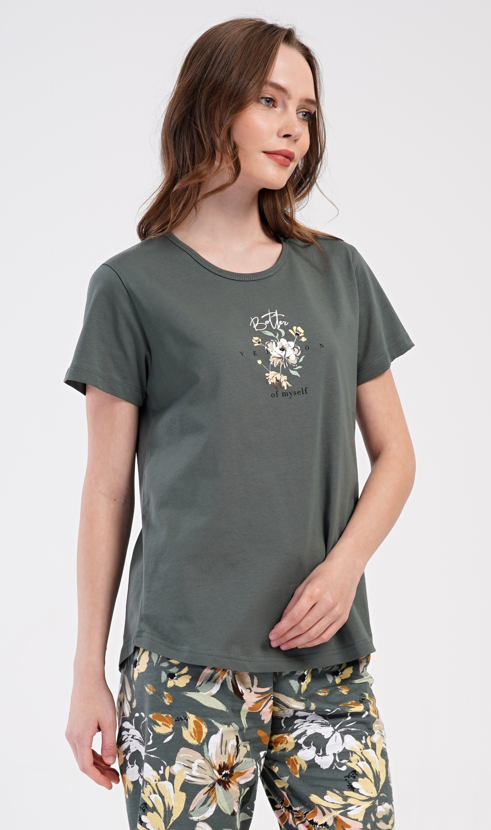 Dámské bavlněné kapri pyžamo značky Vienetta Secret. Dámské pyžamo se skládá z trička s krátkým rukávem a tříčtvrtečních kalhot. Tričko s kulatým výstřihem má na hrudi obrázek květu. Tento motiv se opakuje i na kalhotách, které mají v pase gumu a šňůrku na stažení, jsou bez kapes. Použitý bavlněný materiál je příjemný a poddajný na dotek.