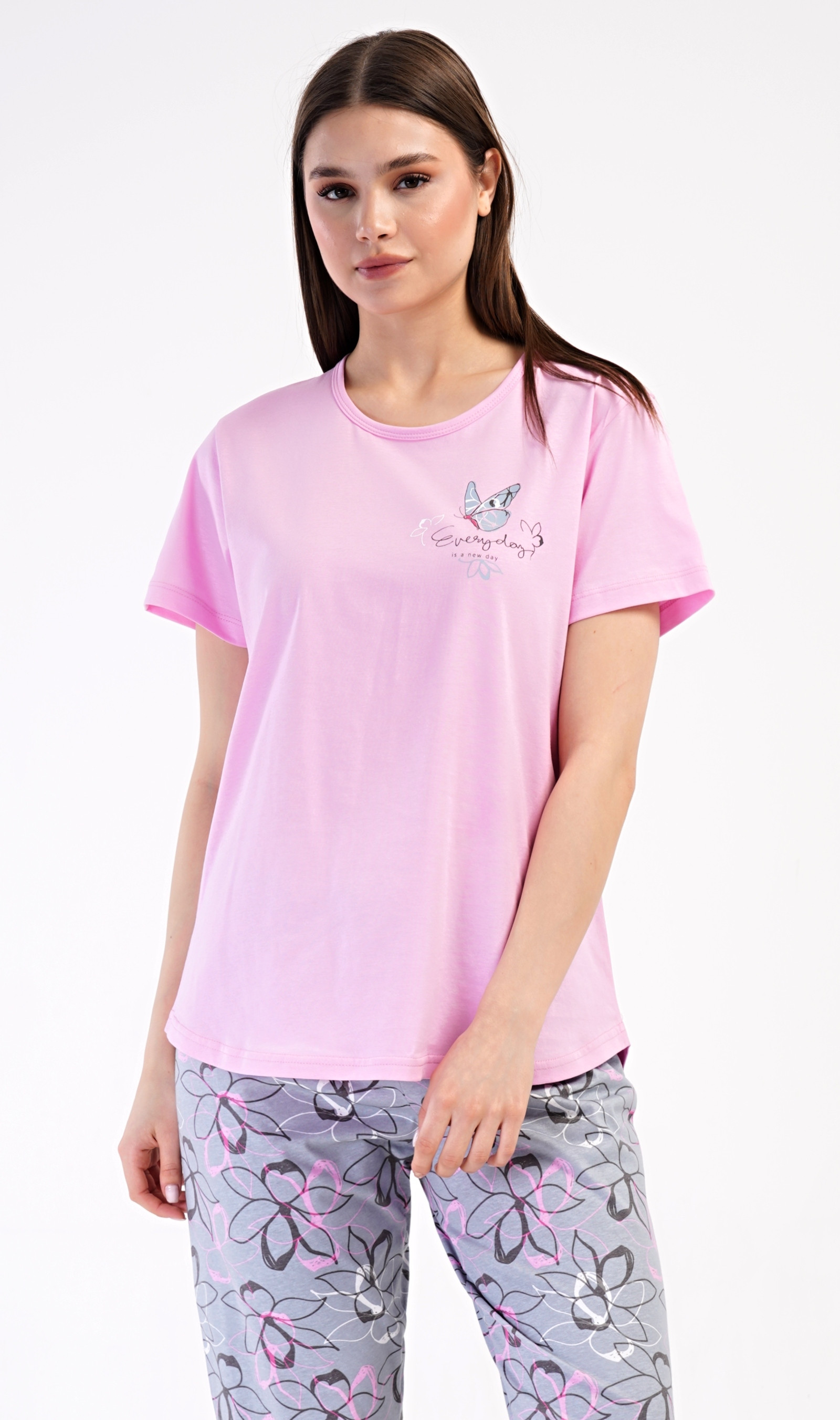 Dámské bavlněné kapri pyžamo Vienetta Secret. Dámské pyžamo se skládá z trička s krátkým rukávem a tříčtvrtečních kalhot. Tričko s kulatým výstřihem zdobí na hrudi obrázek motýlka a nápis 'Everyday'. Kalhoty s potiskem květů mají v pase gumu a šňůrku na stažení, jsou bez kapes. Použitý bavlněný materiál je příjemný a poddajný na dotek.