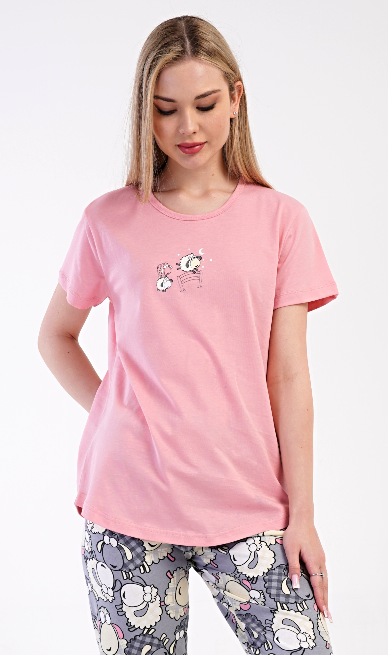 Dámské pyžamo kapri oblíbeného výrobce Vienetta Secret. Dámské pyžamo se skládá z trička s krátkým rukávem a tříčtvrtečních kalhot. Tričko s kulatým výstřihem zdobí obrázek roztomilých oveček. Potisk s motivem oveček se opakuje i na kalhotách, které mají v pase gumu a šňůrku na stažení, jsou bez kapes.   Použitý bavlněný materiál je příjemný a poddajný na dotek.