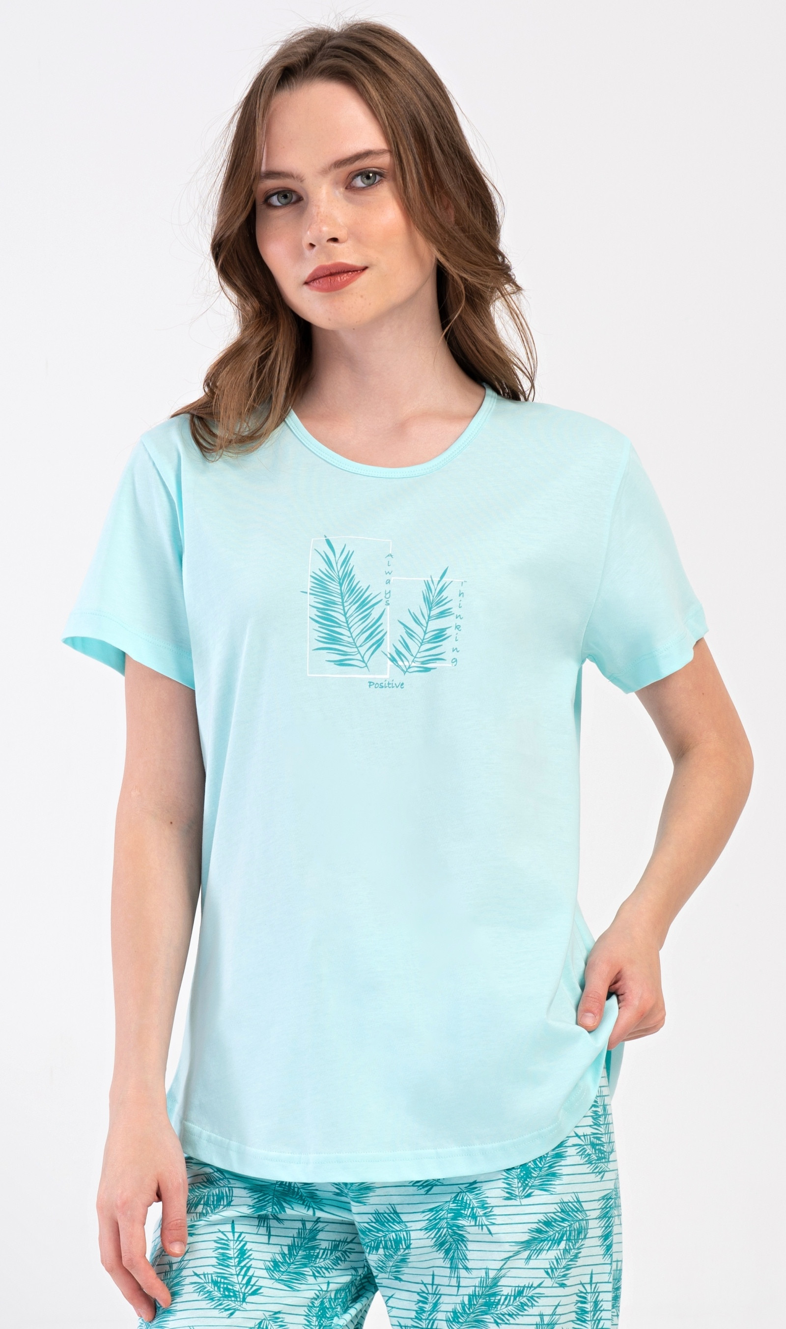 Dámské bavlněné kapri pyžamo značky Vienetta Secret. Dámské pyžamo se skládá z trička s krátkým rukávem a tříčtvrtečních kalhot. Tričko s kulatým výstřihem má na hrudi obrázek větvičky a drobný nápis. Motiv větviček se opakuje i na kalhotách, které mají v pase gumu a šňůrku na stažení, jsou bez kapes. Použitý bavlněný materiál je příjemný a poddajný na dotek.