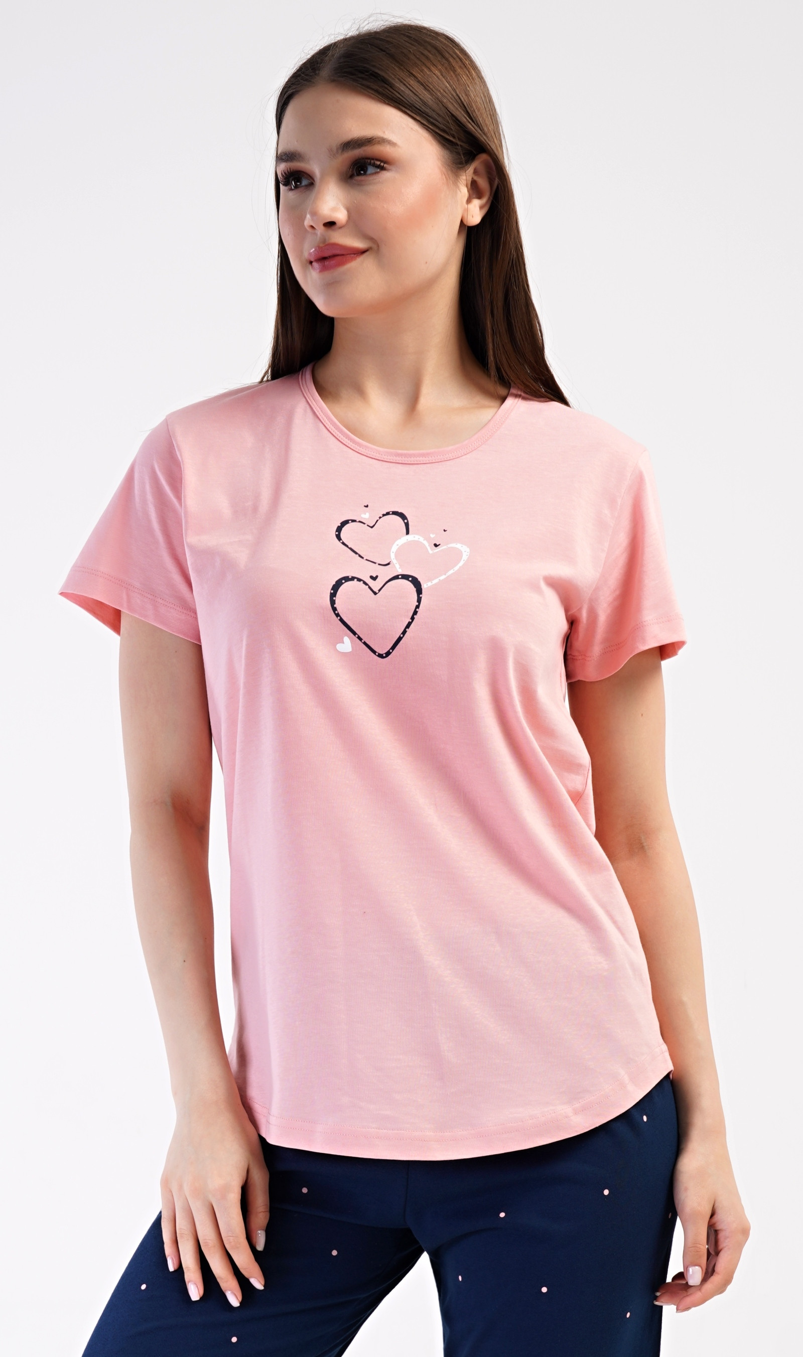 Kvalitní bavlněné dámské kapri pyžamo Srdce. Pyžamo má triko s motivem srdíčka a kalhoty s puntíky. Materiál 100% bavlna