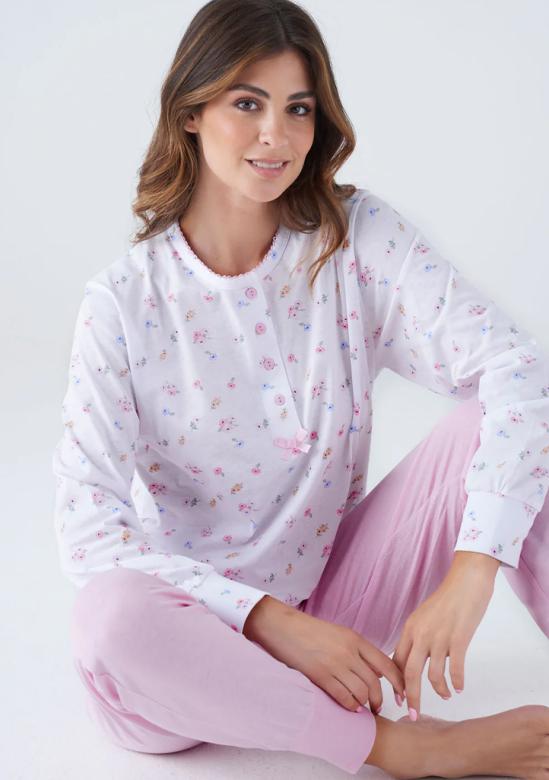 Dámské pyžamo Karelpiu spojuje jemnost, pohodlí a roztomilý design. Horní díl s dlouhým rukávem je zdoben drobným květinovým potiskem, ozdobnými knoflíčky a decentní mašličkou u výstřihu. Příjemný bavlněný materiál zajišťuje maximální komfort během spánku i lenošení. Kalhoty v jednobarevném provedení s pružnými lemy doladí celý outfit k dokonalosti. Pyžamo je dostupné ve dvou barevných variantách – něžné růžové a svěží modré. Materiálové složení: 100% bavlna.