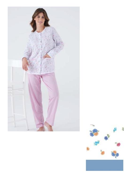 Dámské bavlněné pyžamo značky Karelpiu. Pyžamo se skládá z kabátku s dlouhým rukávem, je celopropínací na knoflíky. Rukávy jsou ukončené volně. Kalhoty jsou v pase do pružné obšité gumy. Pyžamo je ušité z příjemné lehké bavlny. Materiálové složení: 100% bavlna