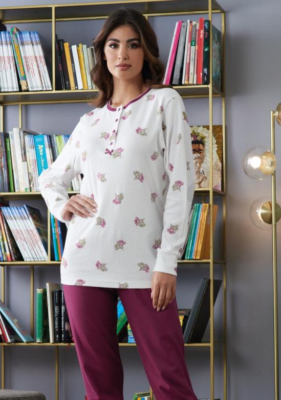 Dámské bavlněné pyžamo značky Karelpiu. Pyžamo se skládá z trička s dlouhým rukávem, okolo krku je kulatý výstřih a léga se třemi knoflíky, pod légou je našitá saténová mašlička. Rukávy jsou ukončené do lemu ze stejného materiálu, jako je tričko. Kalhoty jsou v pase do pružné obšité gumy. Pyžamo je ušité z příjemné hřejivé bavlny a je zabalené v dárkové krabici. Materiálové složení: 100% bavlna
