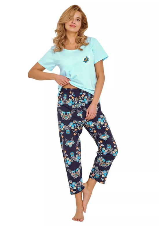 Dámské pyžamo Kristen 3329 značky TARO nabízí příjemnou kombinaci pohodlí a stylu pro vaše domácí chvíle odpočinku. Horní část v jemné mátové barvě s drobnou květinovou aplikací je zárukou svěžesti a jednoduchosti, zatímco kalhoty s tmavě modrým podkladem jsou ozvláštněné výrazným květinovým vzorem v modrých a oranžových odstínech. Volný střih a kulatý výstřih zaručují pohodlné nošení bez omezení, stejně jako pružný pas kalhot přizpůsobený tělu. Tento set je ušitý ze 100% bavlny, což znamená, že pyžamo j...