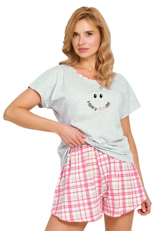 Dámské pyžamo Matilda 3352 TARO nabízí ideální spojení pohodlí a jemné elegance pro každou ženu. Halenka je vyrobena z měkké bavlněné směsi, která zajistí pocit lehkosti i během horkých letních nocí. Jemný kulatý výstřih je ozdoben decentním růžovým lemem, který ladí s hravým potiskem úsměvu a nápisem „Have a nice day“. Kratší kalhoty jsou vyrobeny z příjemné 100% bavlny v růžovo-bílém kostkovaném vzoru, jenž dodává pyžamu svěžest a hravost. Elastický pas zaručuje pohodlné nošení bez nepříjemného tlačení...
