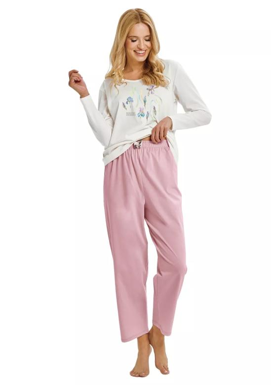 Dámské pyžamo Monica 3459 značky TARO představuje spojení elegance a pohodlí, které si zamilujete při každém večeru doma. Horní díl v krémovém odstínu zdobí jemný květinový motiv, který přináší svěží nádech a ženský šarm. Díky dlouhým rukávům a volnému střihu se budete cítit maximálně uvolněně během odpočinku i spánku. Kalhoty v něžné pastelově růžové barvě mají elastický pas pro snadné oblékání a příjemný pocit po celý den i noc. Měkký materiál ze 100% bavlny je prodyšný, hebký na dotek a vhodný i pro c...
