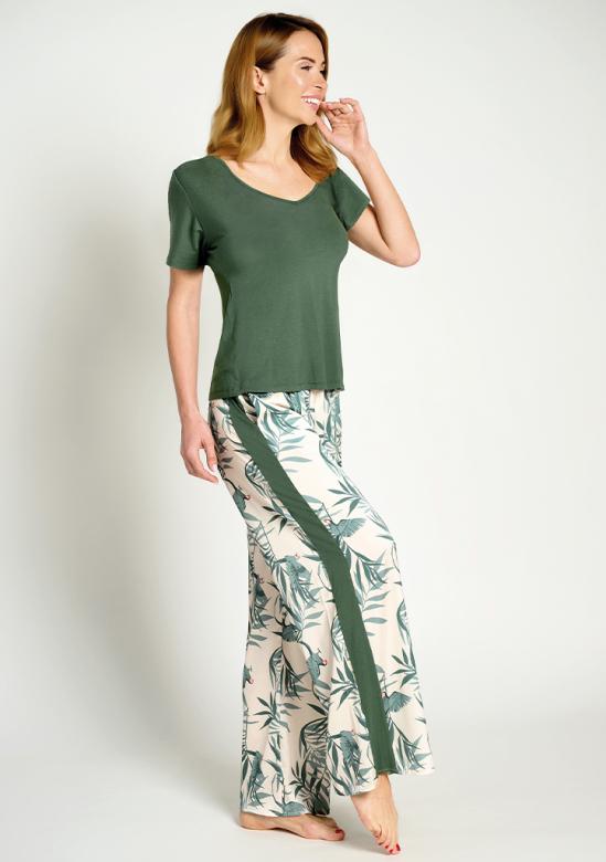 Dámské pyžamo značky Muydemi v elegantním a pohodlném provedení tvoří tričko s krátkým rukávem v tmavě zelené barvě doplněné o dlouhé kalhoty s jemným přírodním motivem. Tričko má kulatý výstřih a volnější střih, který zajišťuje maximální komfort při nošení. Kalhoty mají pohodlný střih, elastický pas a jsou zdobeny decentním vzorem listů a ptáků v přírodních tónech, doplněným o kontrastní boční pruh, který opticky prodlužuje postavu. Lehký a příjemný materiál je ideální pro klidný spánek i domácí relaxac...