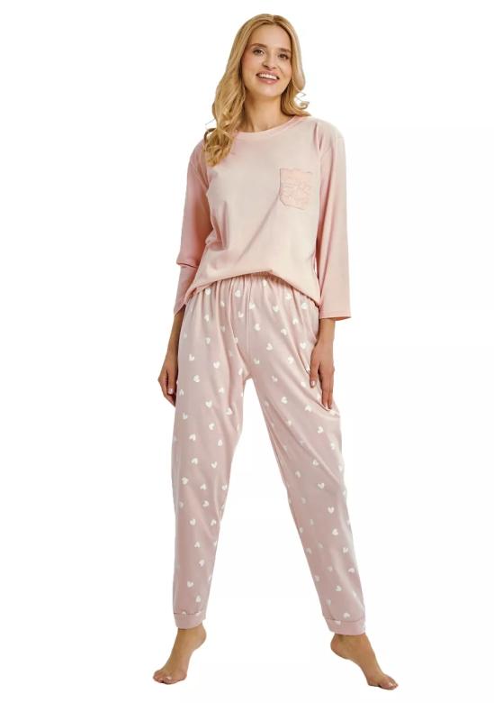 Dámské pyžamo Nori 3442 značky TARO přináší dokonalou rovnováhu mezi pohodlím a elegantním stylem, který si zamilujete při každém večeru doma. Horní díl v jemném pastelově růžovém odstínu s kulatým výstřihem a tříčtvrtečními rukávy působí vzdušně, zatímco malá kapsička na hrudi dodává praktický i dekorativní detail. Spodní část tvoří volné kalhoty s pružným pasem, které se směrem ke kotníkům lehce zužují pro maximální pohodlí a volnost pohybu. Jemný potisk drobných bílých srdcí vnese do Vašeho odpočinku ...