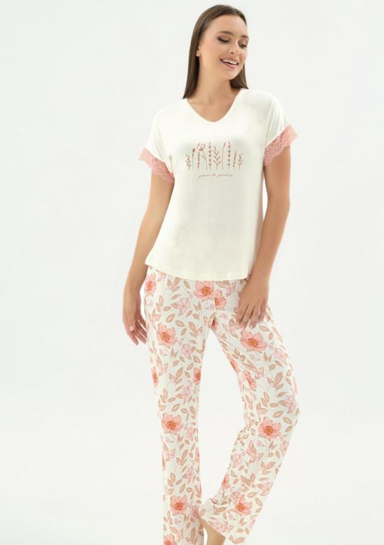 Dámské pyžamo s krátkým rukávem spojuje pohodlí s jemnými ženskými detaily. Tričko je doplněno rukávy zakončenými krajkou, která dodává celému modelu elegantní a romantický vzhled. Přední stranu zdobí stylová aplikace, jež podtrhuje celkový design. Dlouhé kalhoty mají pohodlný střih a pas do gumy, díky kterému se skvěle přizpůsobí postavě a zajistí maximální komfort při nošení i spánku. Příjemný materiál a promyšlené provedení dělají z tohoto pyžama ideální volbu pro každodenní odpočinek. Materiálové s...