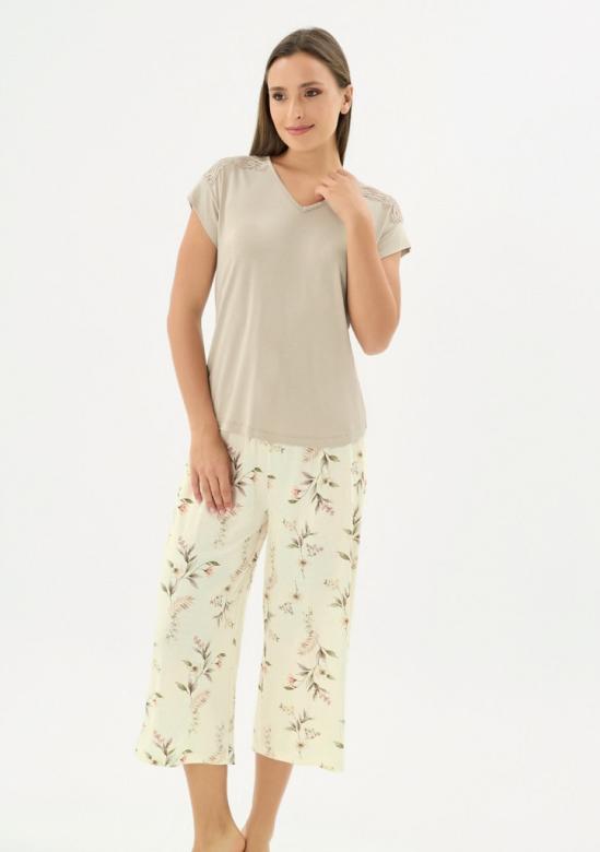 Dámské viskózové pyžamo je ideální volbou pro pohodlný spánek i domácí relaxaci. Příjemný a prodyšný materiál z viskózy je jemný na dotek a zajišťuje maximální komfort po celou noc. Horní díl tvoří tričko s krátkým rukávem, který je zakončen výraznějším lemem. Ramena zdobí jemná krajka, která dodává celému modelu ženský a elegantní vzhled. Kalhoty v praktické 7/8 délce mají pohodlný střih a pružný pas do gumy, díky čemuž se skvěle přizpůsobí postavě a neomezují v pohybu. Stylové a zároveň pohodlné pyžamo...
