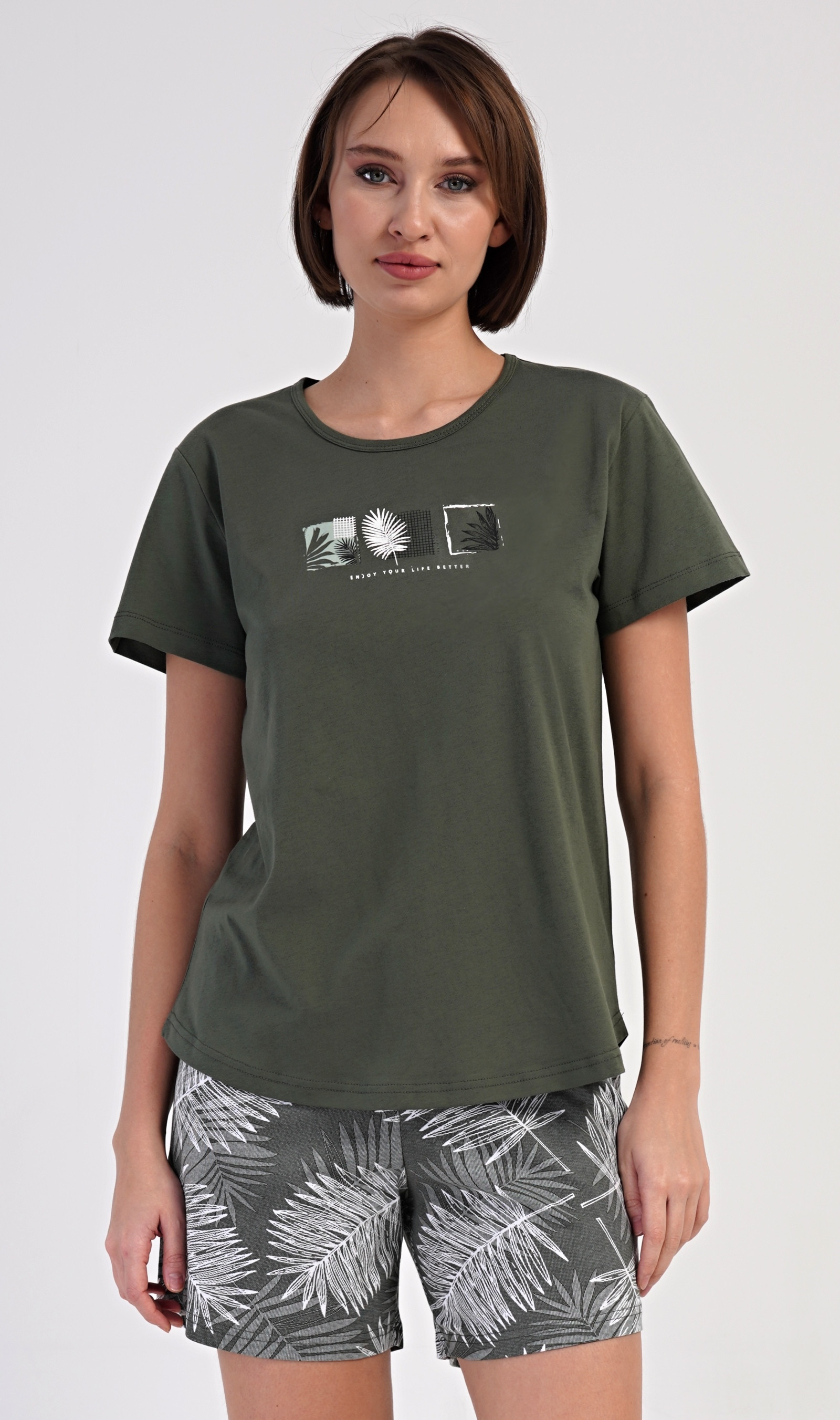 Dámské bavlněné pyžamo šortky značky Vienetta Secret. Dámské pyžamo se skládá z trička s krátkým rukávem a šortkových kalhot. Na jednobarevném tričku jsou obrázky palmových listů. Stejný motiv se opakuje i na šortkách, které mají v pase gumu a šňůrku na stáhnutí, jsou bez kapes. Použitý bavlněný materiál je příjemný a poddajný na dotek.