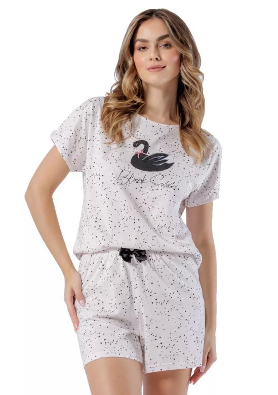 Dámské pyžamo Zuzia 1556 LEVEZA je ideální volbou pro pohodlné spaní i relaxaci doma. S kulatým výstřihem a krátkými rukávy nabízí svěží a lehký design, který zdobí jemný obrázek labutě s nápisem Black Swan pro stylový detail. Kalhoty pyžama jsou řešeny jako kraťasy bez kapes, s širokou gumou v pase zajišťující optimální komfort nošení. Materiál: 100% bavlněný úplet poskytuje měkkost a prodyšnost, což je ideální pro příjemné nošení po celou noc. Díky spojení přírodních materiálů a pečlivému střihu přiná...