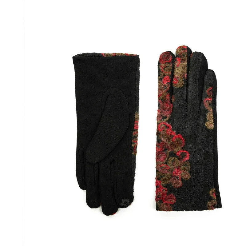 Neteradičně zdobené dámské rukavice, velikost 3. Černé s květovaným červeným potiskem. Materiálové složení: 100% Polyester