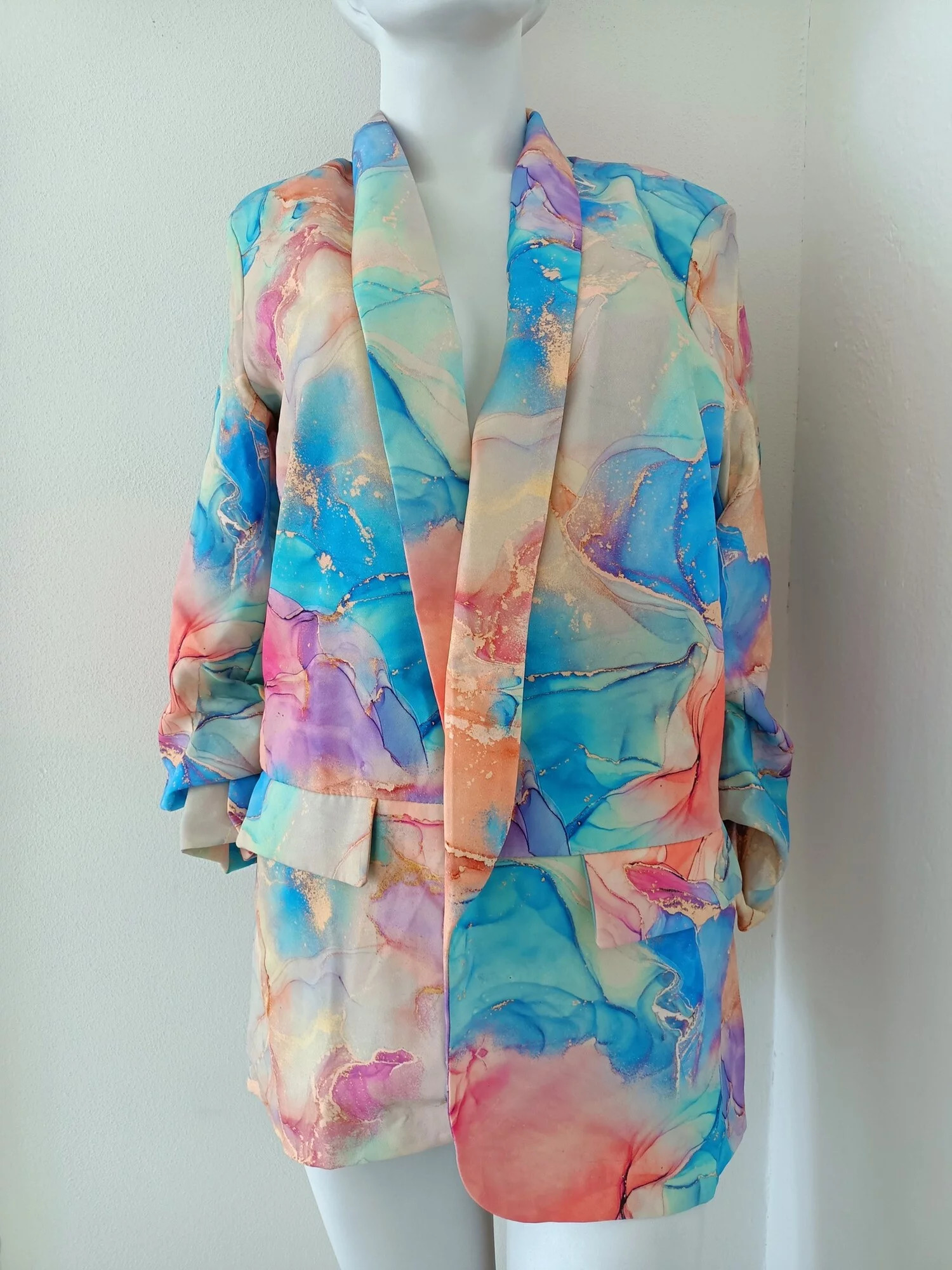 Dámské různobarevné sako se shrnutými rukávy. příslušenství: všité ramenní vycpávky, podšívka Složení materiálu: 95% polyester, 5% elastan způsob praní: praní v pračce na 30 °C Modelka má na sobě velikost S. Rozměry modelky: výška 175 cm, prsa 84 cm, pas 65 cm, boky 92 cm. Rozměry bundy ve velikosti S měřené na plocho: šířka v podpaží - 48 cm, celková délka - 70 cm, délka rukávu - 47 cm. Velikost Alt. Výška Obvod hrudníku hrudník Externí. délka. rukáv Vnitřní. délka rukávů S 36 160-164 82 59 49 M 38 162-172 86 61 51 L 40 164-174 91 63 53 XL 42 166-178 96 65 55 2XL 44 168-180 100 67 57