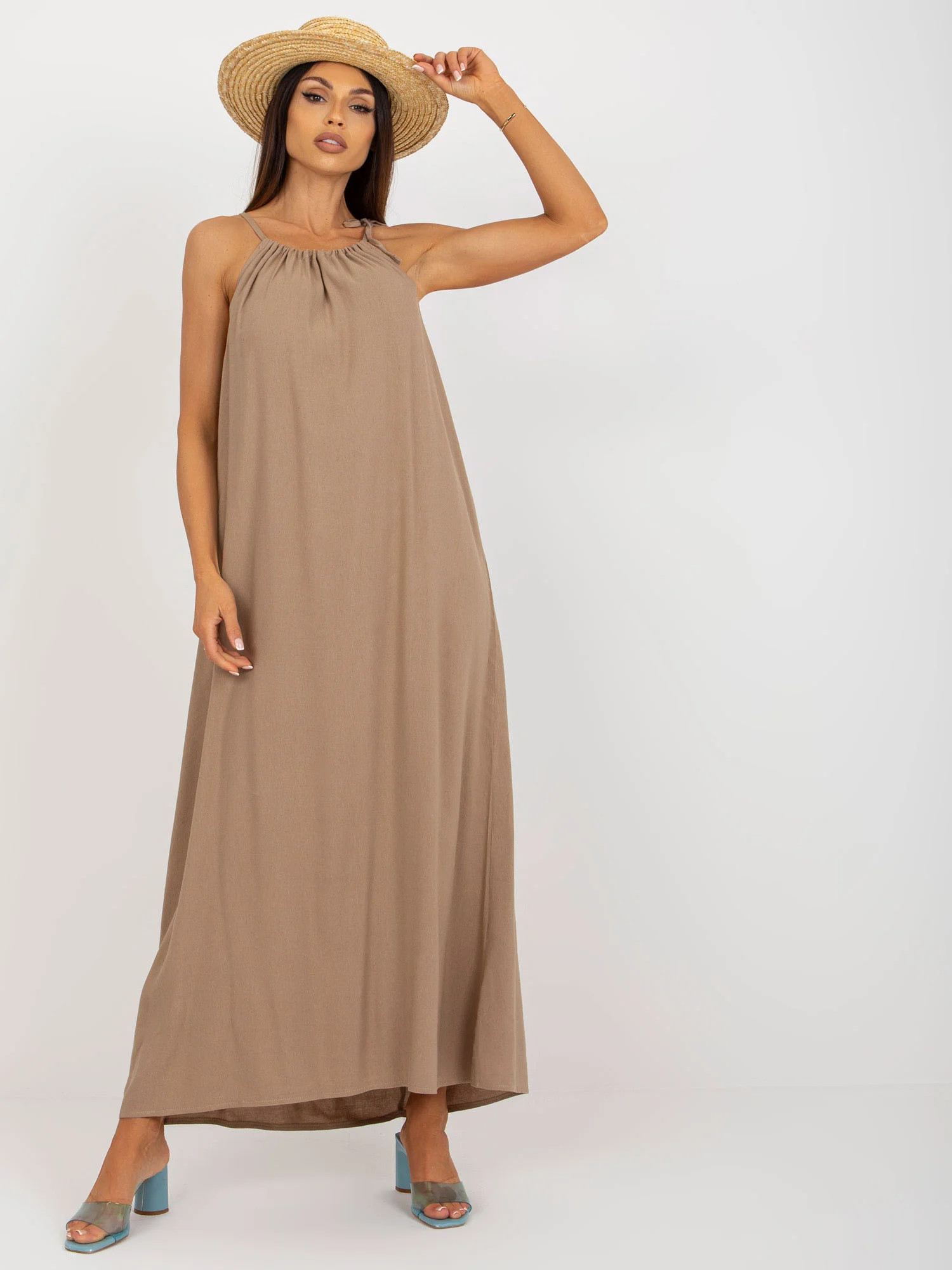 Tmavě béžové letní oversize šaty s plátnem OCH BELLA . hladký vzor bez zapínání volný, splývavý střih ramínka na zavázání Materiálové složení: 50% bavlna, 25% len, 25% viskóza Mezinárodní velikost Výška Obvod hrudníku Obvod pasu S 36 160-168 82 72-80 M 38 162-172 86 78-86 L 40 164-174 91 84-90 XL 42 166-178 96 88-96