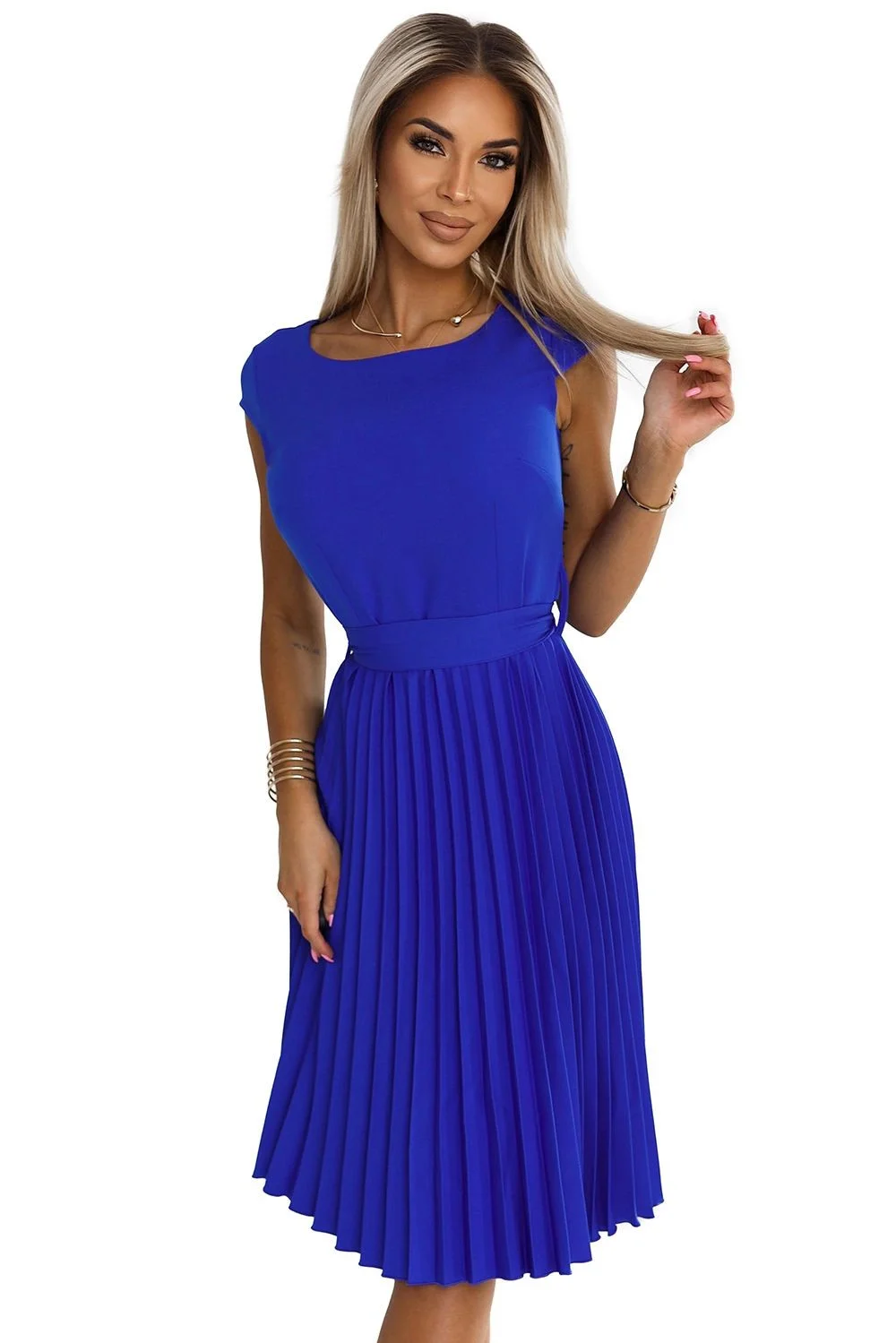 Dámské šaty 311-16 LILA NUMOCO - královská modrá barva - řasený střih - krátké rukávy - délka sukně nad kolena - kapsy - zavazování na pásek s velkou mašlí - zapínání vzadu na skrytý zipMateriálové složení: 95% polyester + 5% elastan