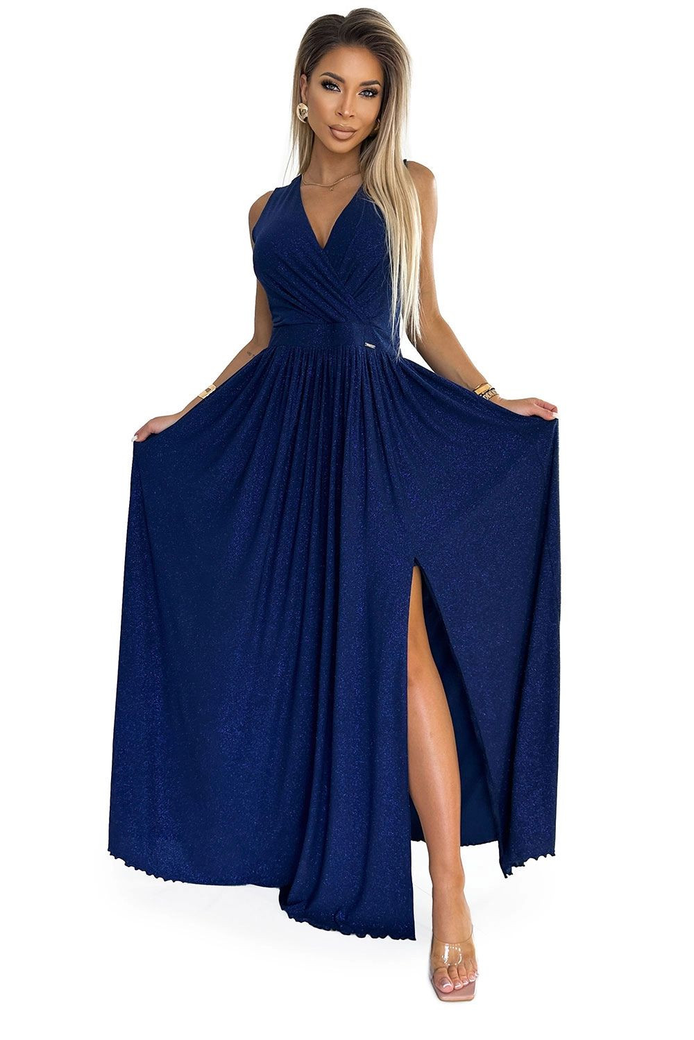 Dámské šaty 362-9 JUSTINE NUMOCO - tmavě modrá barva - ze vzdušného materiálu v pudrově růžové barvě s brokátem - široká ramínka - psaníčkový výstřih - zapínání vzadu na skrytý zip - zavazování za krkem - s rozparkemMateriálové složení: 95% polyester + 5% elastan