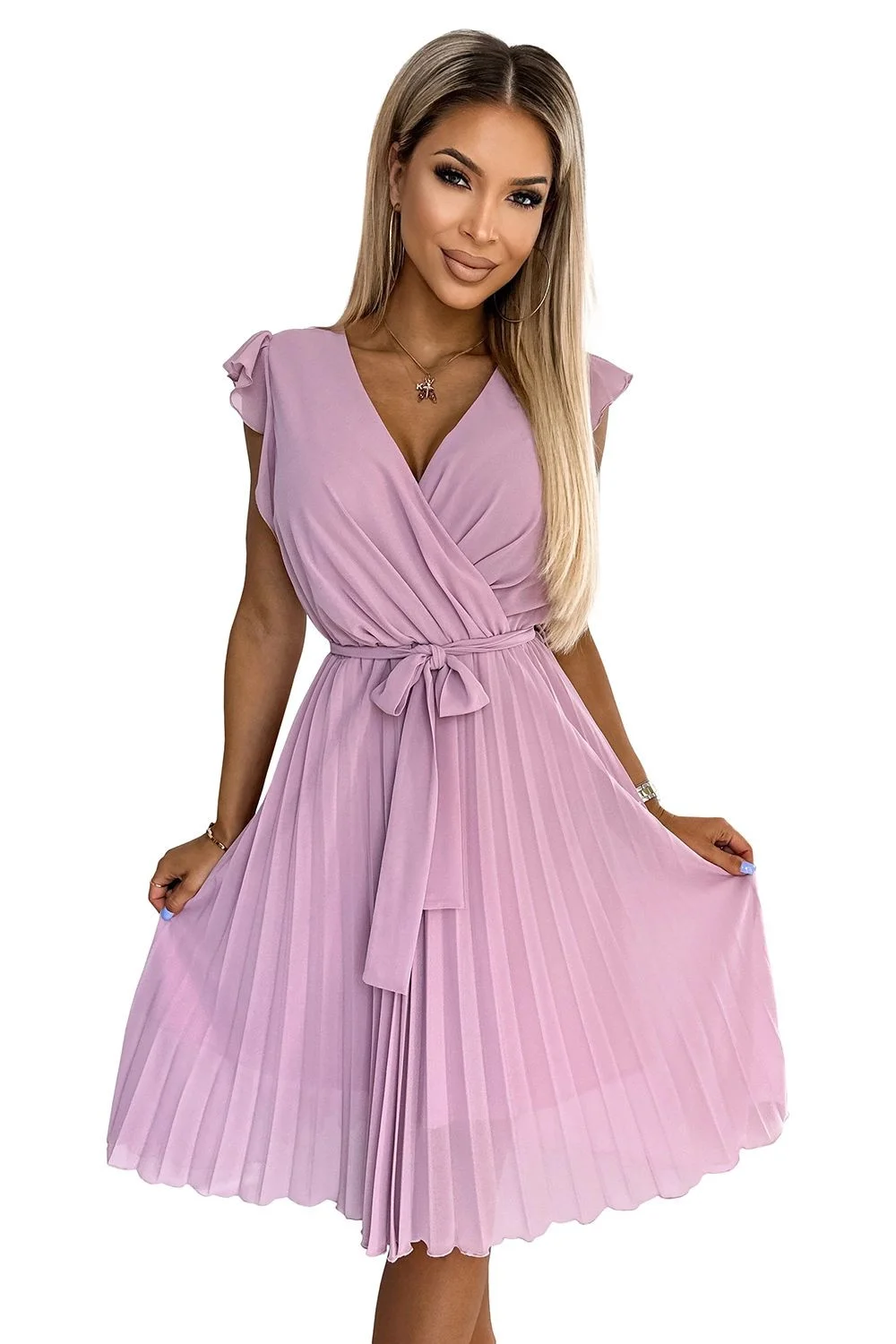 Dámské šaty 374-3 POLINA Numoco - elegantní dámské šaty - bez rukávů - ramena ozdobená volánky - překřížený výstřih - v pase na pásek - rozšířená šifónová sukněMateriálové složení: 95% polyester + 5% elastan