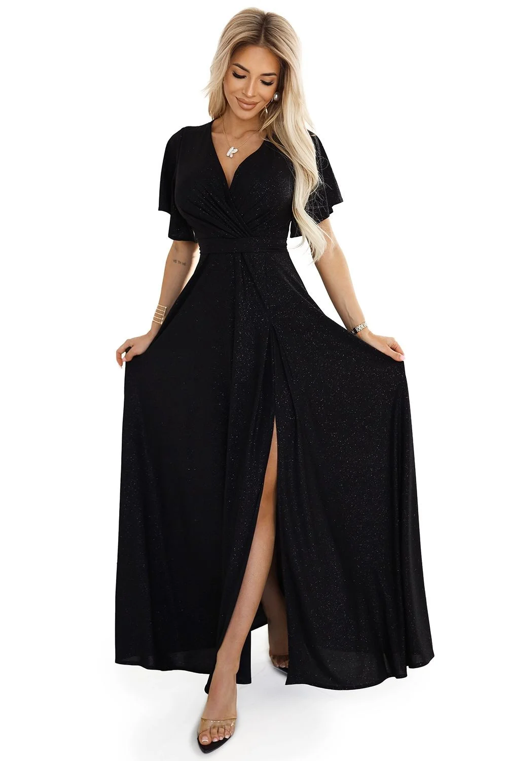 Dámské šaty 581-1 JENNIFER NUMOCO - černá barva - z lesklého brokátu - krátké rukávy - psaníčkový výstřih - dlouhý rozparek - vypasovaný střih s páskemMateriálové složení: 95% polyester + 5% elastan