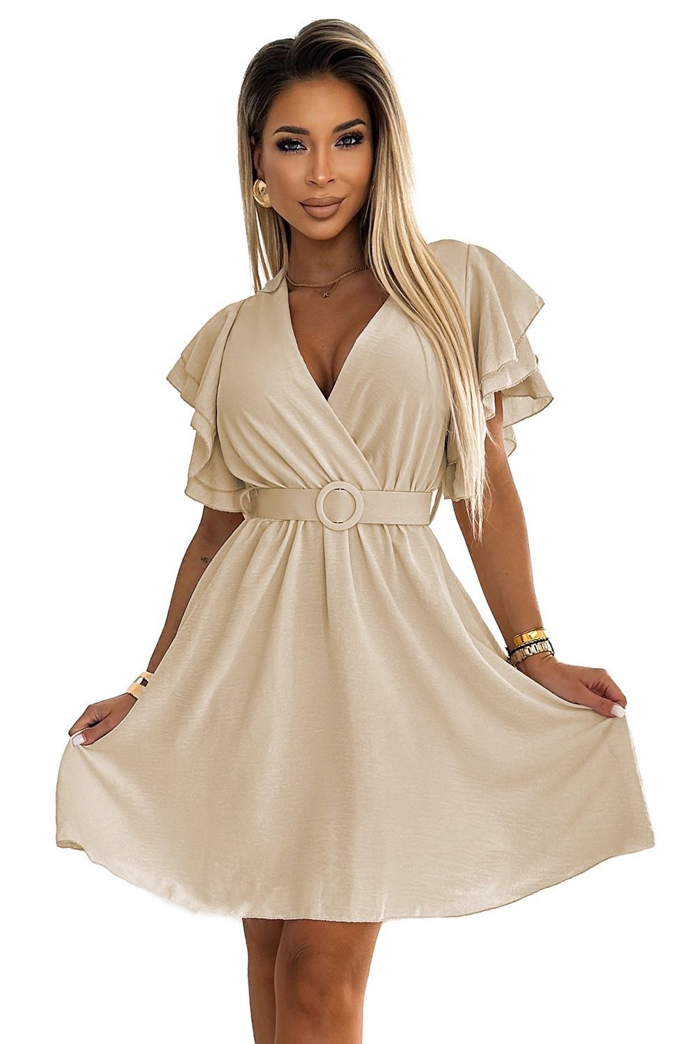 Dámské šaty 586-1 Numoco basic - béžová barva - z mačkaného materiálu - volné krátké rukávy - zavinovací výstřih - ležérní sukně - široký pásek zvýrazňuje pasMateriálové složení: 95% viskóza + 5% elastan