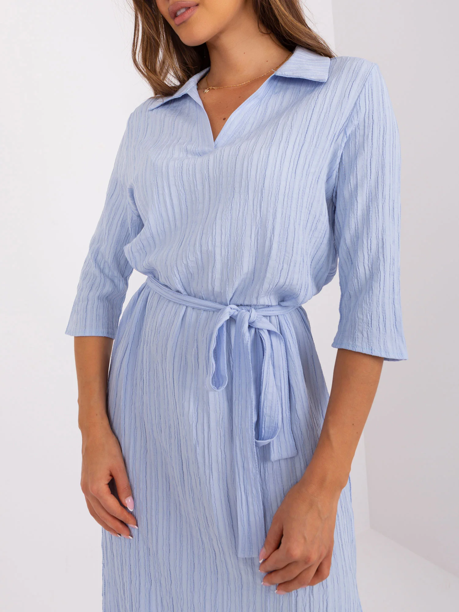 Světle modré šaty pro každodenní nošení z viskózy . Kód produktu: LK-SK-509342-1.51P dominantní vzor: různorodá textura tkaniny styl: ležérní příležitost: neformální, pracovní, městské, letní Modelka má na sobě velikost S/M. Rozměry modelky: výška 173 cm, prsa 89 cm, pas 65 cm, boky 91 cm. Rozměry šatů ve velikosti S/M měřené na plocho: šířka v podpaží - 55 cm, délka rukávu - 41 cm, celková délka - 123 cm. Mezinárodní velikost Výška Obvod hrudníku Obvod pasu M/L 38-40 162-174 86-91 78-90 S/M 36-38 160-172 82-86 72-86