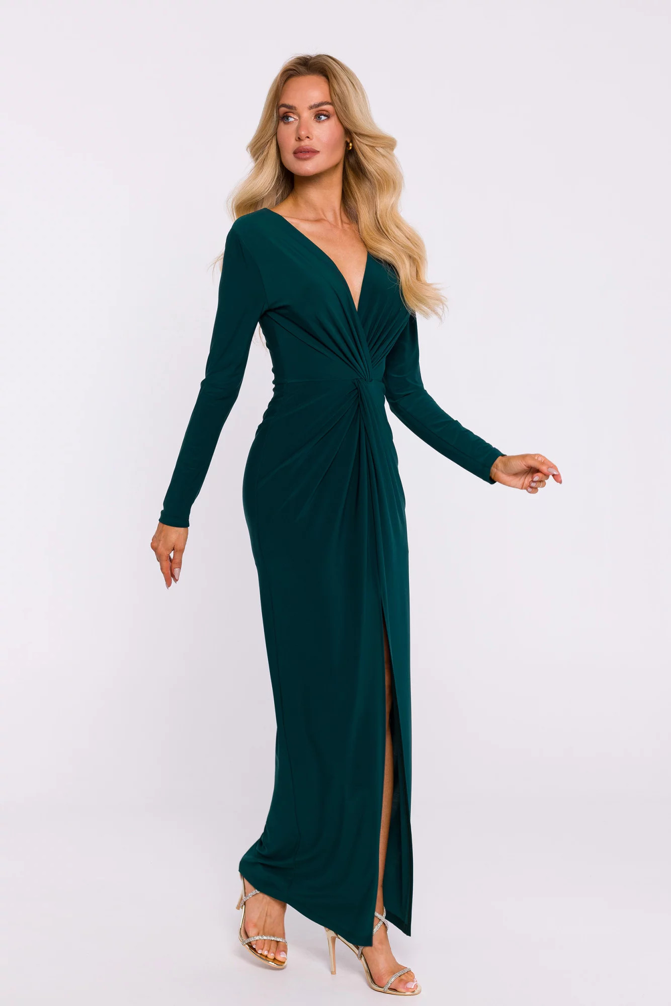 Pletenina, elastické maxi šaty s uzlem vpředu, výstřih ve tvaru V, vysoký rozparek vpředu, modelující záhyby vzadu, skrytý boční zip, bez podšívky, naše modelka měří 171 cm a nosí velikost S, navrženo a vyrobeno v Polsku . Materiál: 95% polyester, 5% elastan Barva: lahvově zelená Pohlaví: ženské Kolekce: jaro/léto/podzim/zima Pokyny pro péči: pokyny pro praní: 30 °C Praní v pračce Kategorie: Dámské oblečení | Šaty | Midi šaty