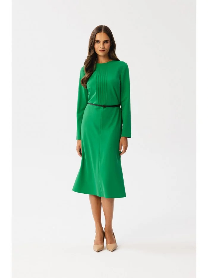 65% polyester 30% viskóza 5% elastan DETAILY PRODUKTU: šaty z tkané látky s ozdobnými svislými záševky v přední části dlouhé rukávy spona pásek z umělé kůže součástí balení délka pod kolena a šikmý střih sukně bez podšívky skrytý zip na zádech naše modelka měří 174 cm a nosí velikost S navrženo a vyrobeno v Polsku VELIKOST S M L XL XXL A 39,5 cm 40,5cm 41,5cm 42,5 cm 43,5 cm B 44cm 46,5 cm 49cm 51,5 cm 54cm C 36,5cm 39cm 41,5cm 44cm 46,5 cm D 46,5cm 49cm 51,5cm 54cm 56,5cm E 59cm 59,5cm 60cm 60,5 cm 61cm F 113cm 114,5cm 116cm 117,5cm 119cm