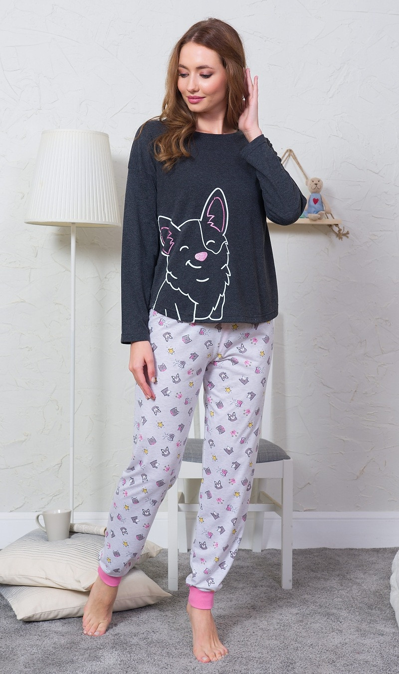 Dámské pyžamo dlouhé Sabina. Pyžamo v šedé barvě se světle šedými kalhotami s jemnými obrázky. Materiál 70% bavlna 30% polyester