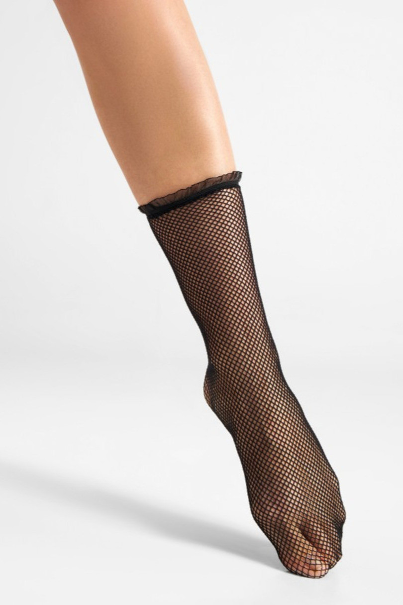 Elegantní kabaretní podkolenky s malými očky zakončené volánkem z organzové krajky.