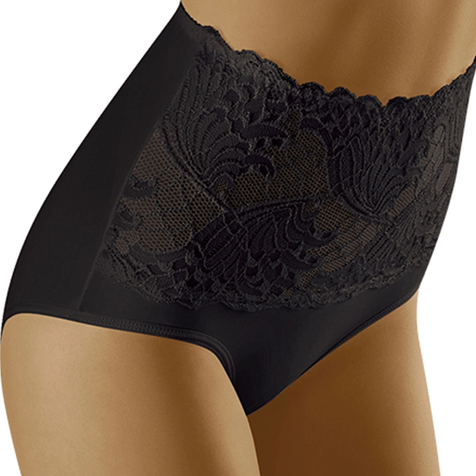 Dámské stahovací kalhotky Kaja black Wol-bar - černá barva - z kvalitního mikrovlákna s tvarovacím efektem - vyšší pas - přední část z ažurové krajky - zadní část je hladkáMateriálové složení: 83% polyamid + 17% elastan