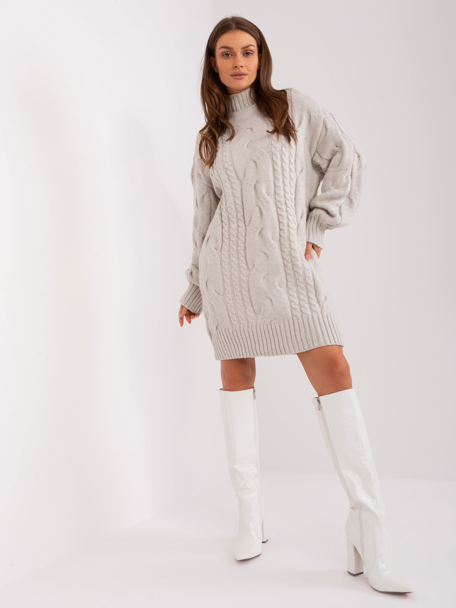 Světle béžové úpletové šaty oversize střihu . kód produktu: AT-SW-2367-1.35P dominantní vzor: různorodá textura tkaniny styl: ležérní příležitost: neformální, do práce, na procházku, do města Modelka má na sobě jednu velikost. Rozměry modelky: výška 170 cm, poprsí 93 cm, pas 66 cm, boky 93 cm. Rozměry šatů v jedné velikosti měřené na plocho: šířka v podpaží - 65 cm, délka rukávu - 68 cm, celková délka - 90 cm .