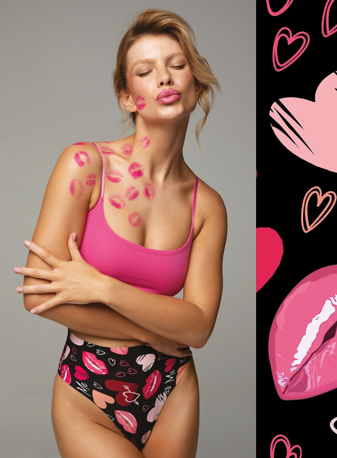 Dámská tanga - poutavý potisk rtů a srdíček - na bocích - s ultratenkou úpravou okrajů s technologií INVISIBLE_LINE -netlačí, neukazuje se pod oblečením - dodává pocit lehkosti a pohodlí - baleno v krabičce s ozdobným srdíčkem - ideální jako dárek   Složení: 89 % polyamid, 10 % elastan, 1 % bavlna