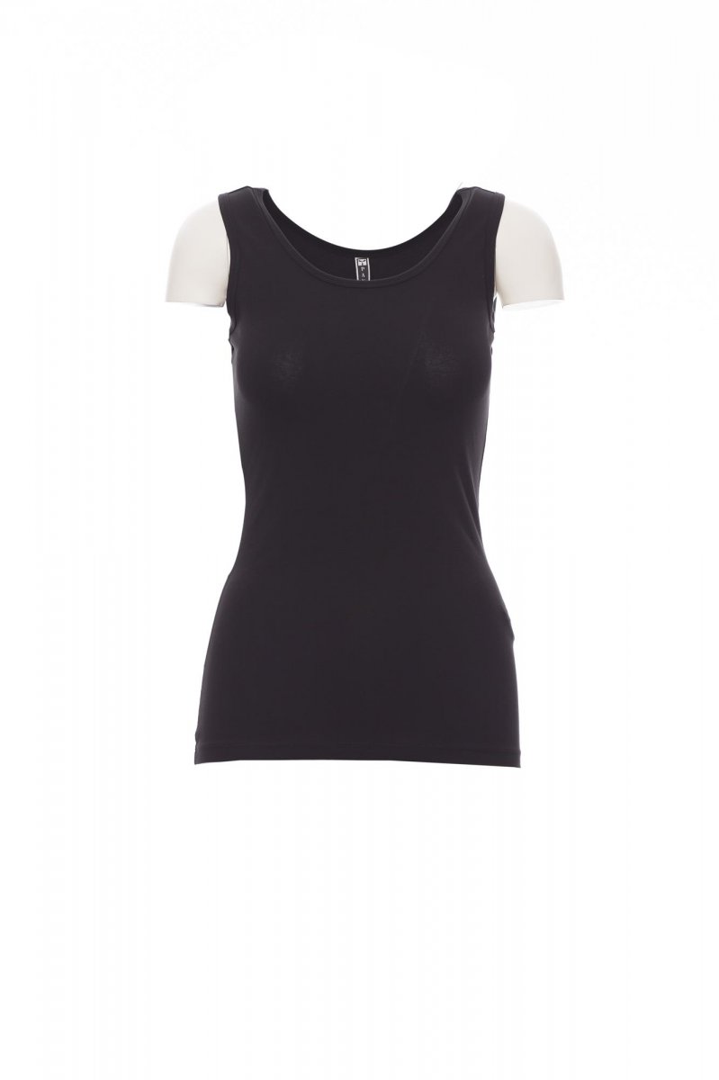 Dámské vyštíhlené tílko s hlubokým kulatým výstřihem, 1 cm lem u krku a u rukávu.