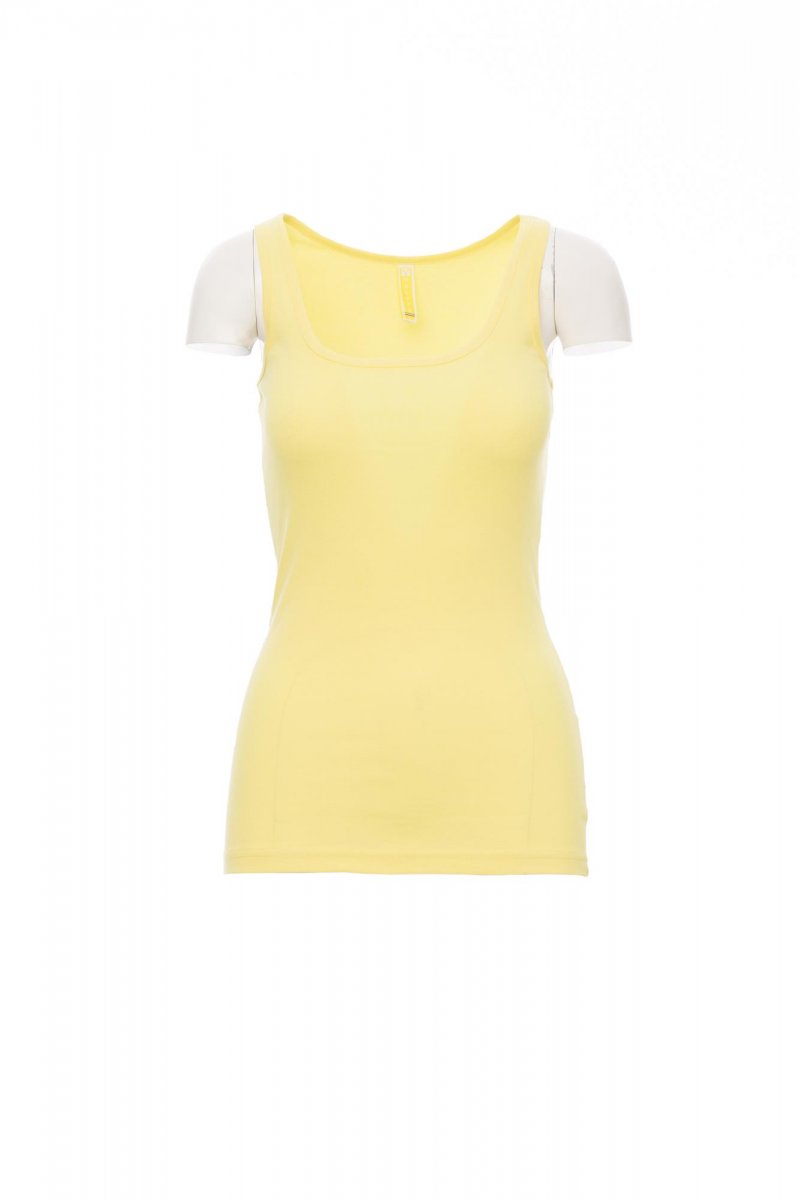 Dámské vyštíhlené tílko s hlubokým kulatým výstřihem, 1 cm lem u krku a u rukávu, překřížená ramínka na zádech.