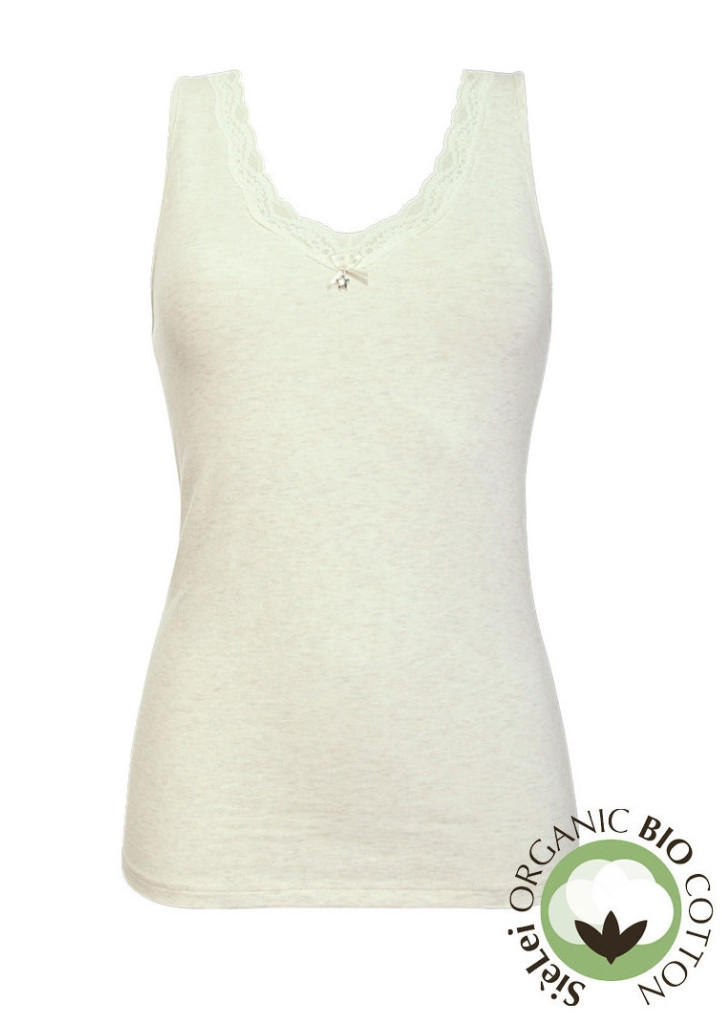 Dámské tílko z nové kolekce EveryBody od značky Siélei. Tílko je z organické bavlny, proto je velmi jemné a příjemné. Má výstřih do V s kombinací krajky. Uprostřed je našitá malá mašlička s ozdobnou hvězdičkou. Je baleno v dárkové krabičce. Materiálové složení: 95% bavlna, 5% elastan, 85% polyamid, 15% elastan