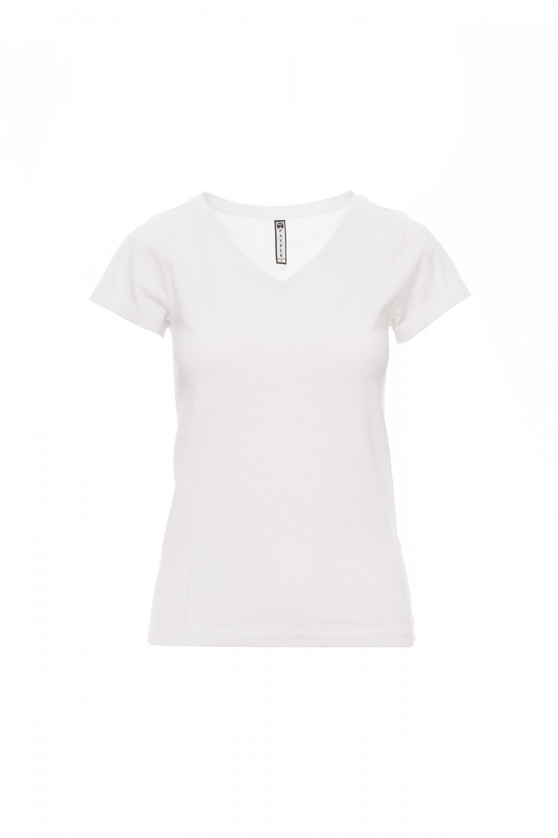 Dámské vyštíhlené tričko s krátkým rukávem a hlubokým výstřihem do V, pružný žebrovaný lem 1,2 cm ze směsi spandex ve spodní části, krátké přiléhavé rukávy a postranní šev pro pohodlnější nošení, dvojjehlové prošití na ramenou, bavlněná spodní část límečku a pásky.