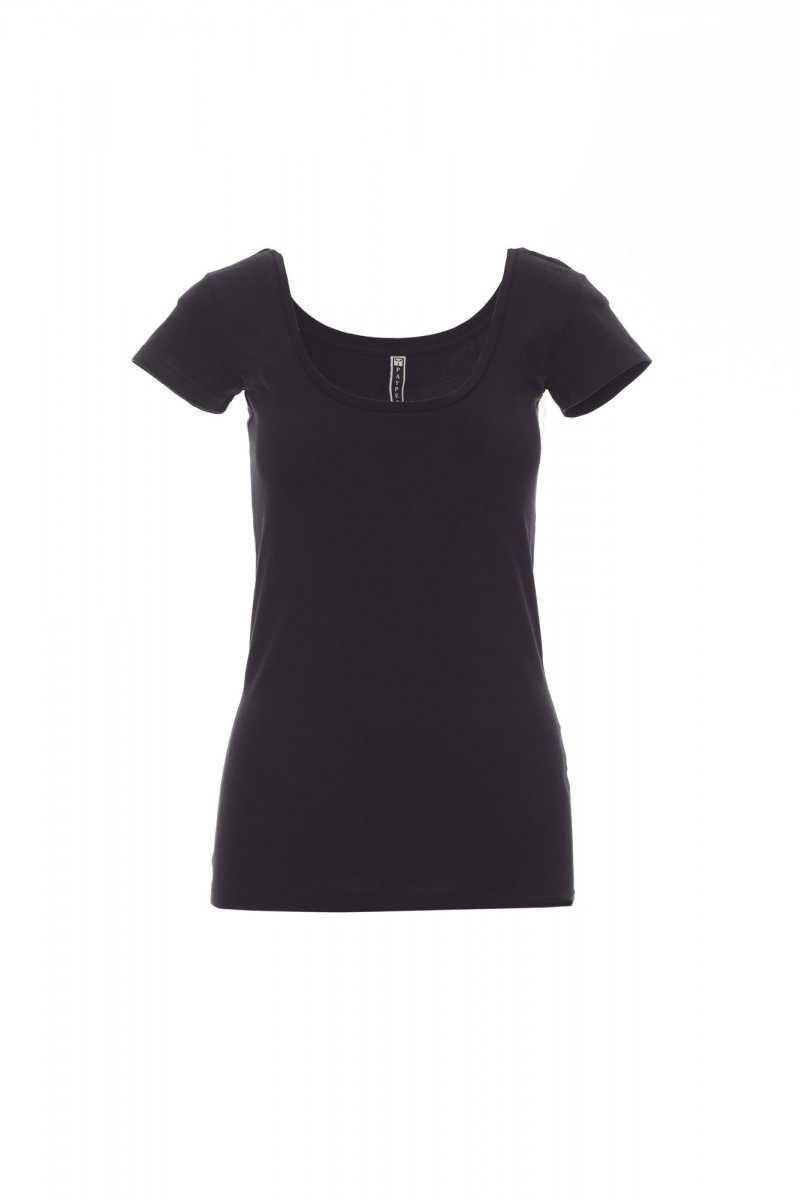 Dámské vyštíhlené tričko s krátkým rukávem a hlubokým hranatým výstřihem, 1 cm nízký lem u krku, postranní sešití.