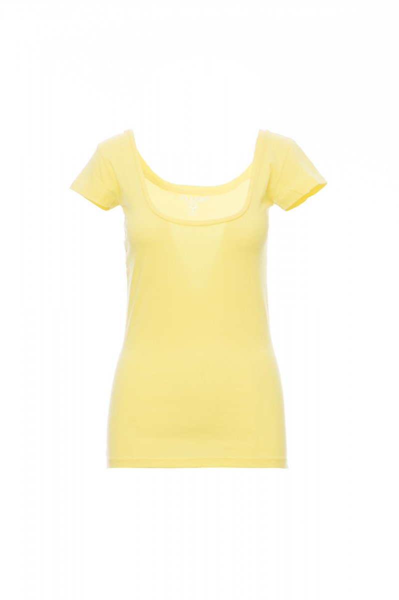 Dámské vyštíhlené tričko s krátkým rukávem a hlubokým hranatým výstřihem, 1 cm nízký lem u krku, postranní sešití.