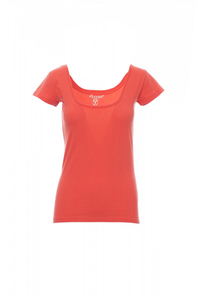 Dámské vyštíhlené tričko s krátkým rukávem a hlubokým hranatým výstřihem, 1 cm nízký lem u krku, postranní sešití.
