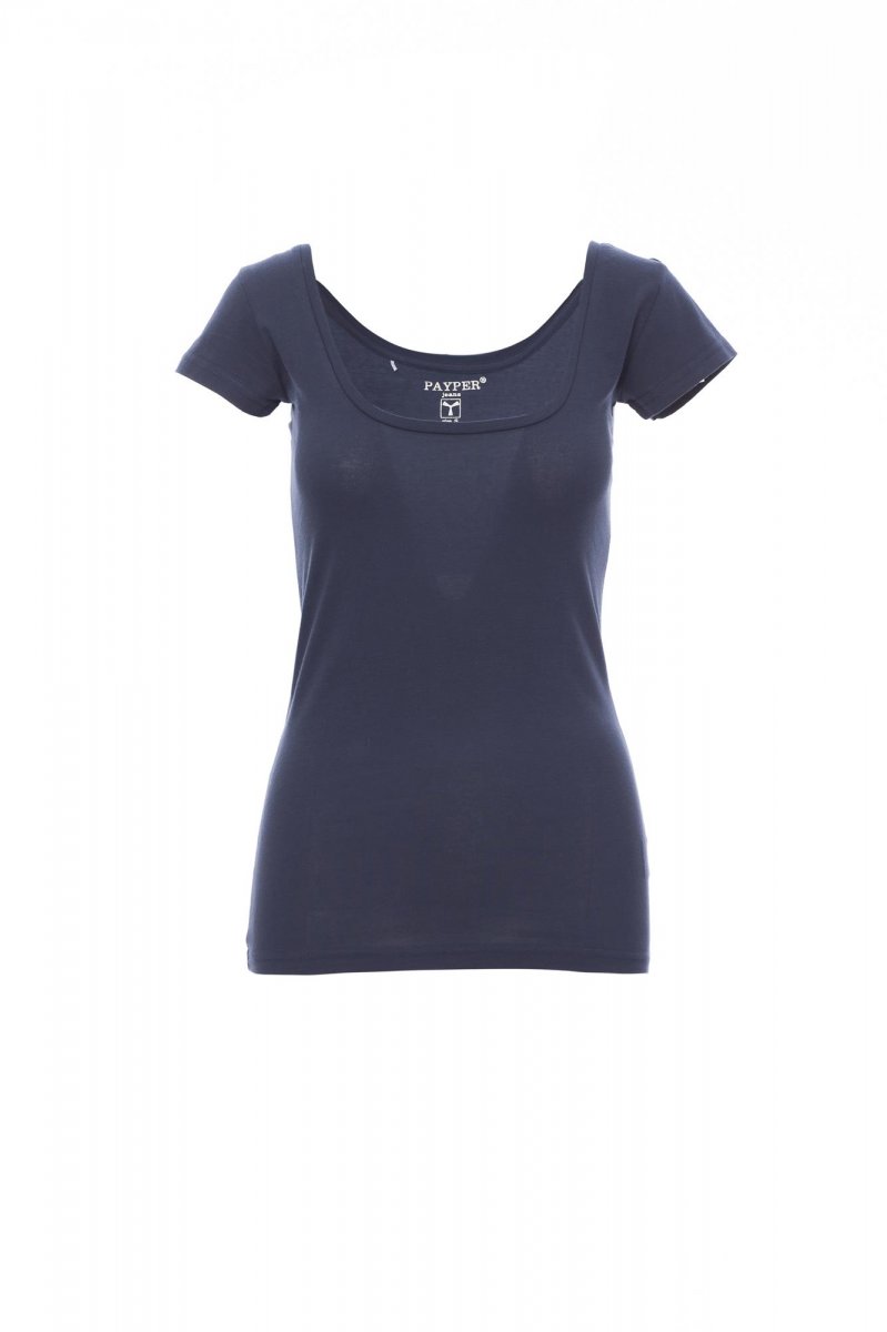 Dámské vyštíhlené tričko s krátkým rukávem a hlubokým hranatým výstřihem, 1 cm nízký lem u krku, postranní sešití.