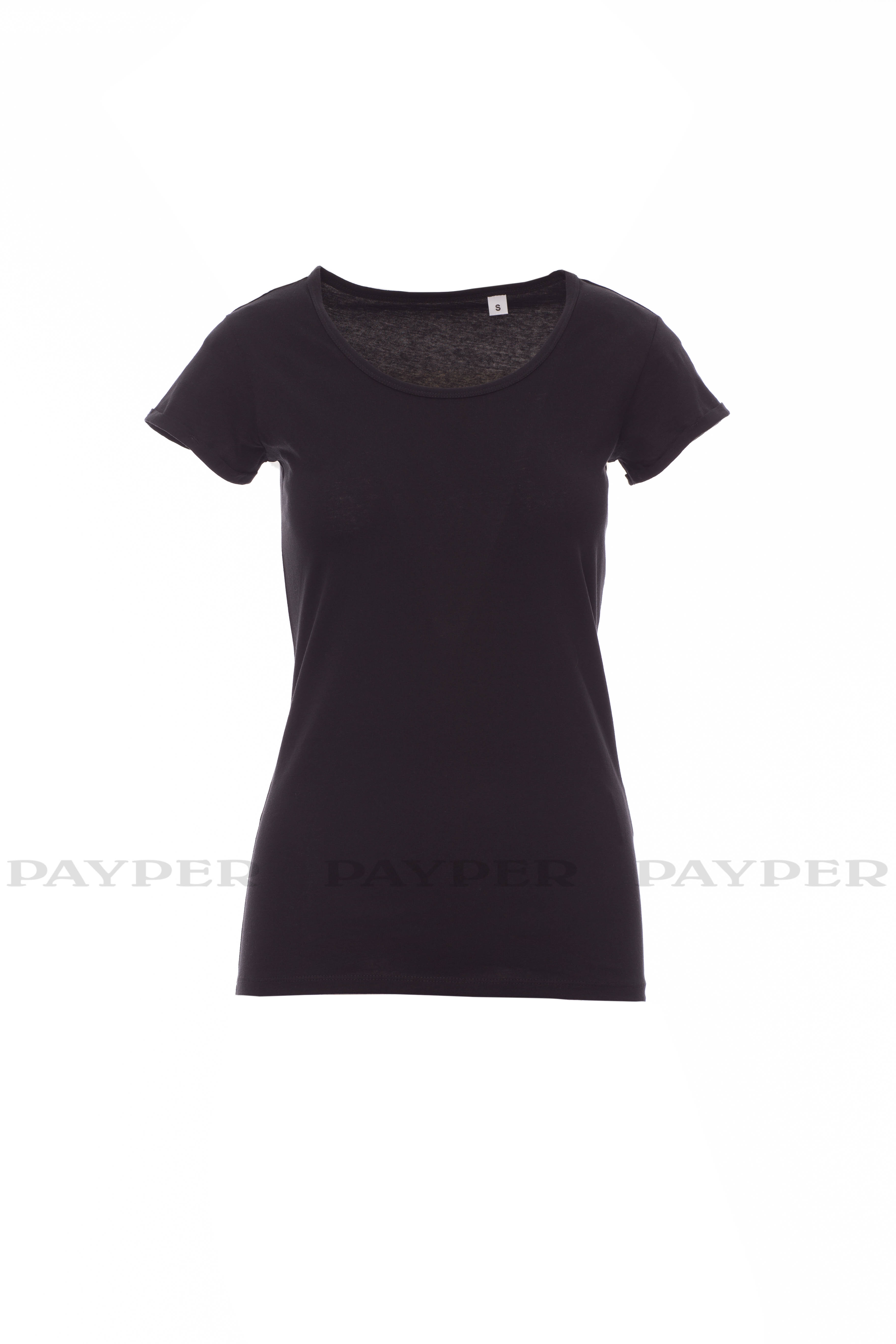 Dámské tričko s krátkým rukávem a krátkým výstřihem, s úzkým okrajem kolem krku, rukávy s úzkým surovým povrchem, boční švy. Bez štítku