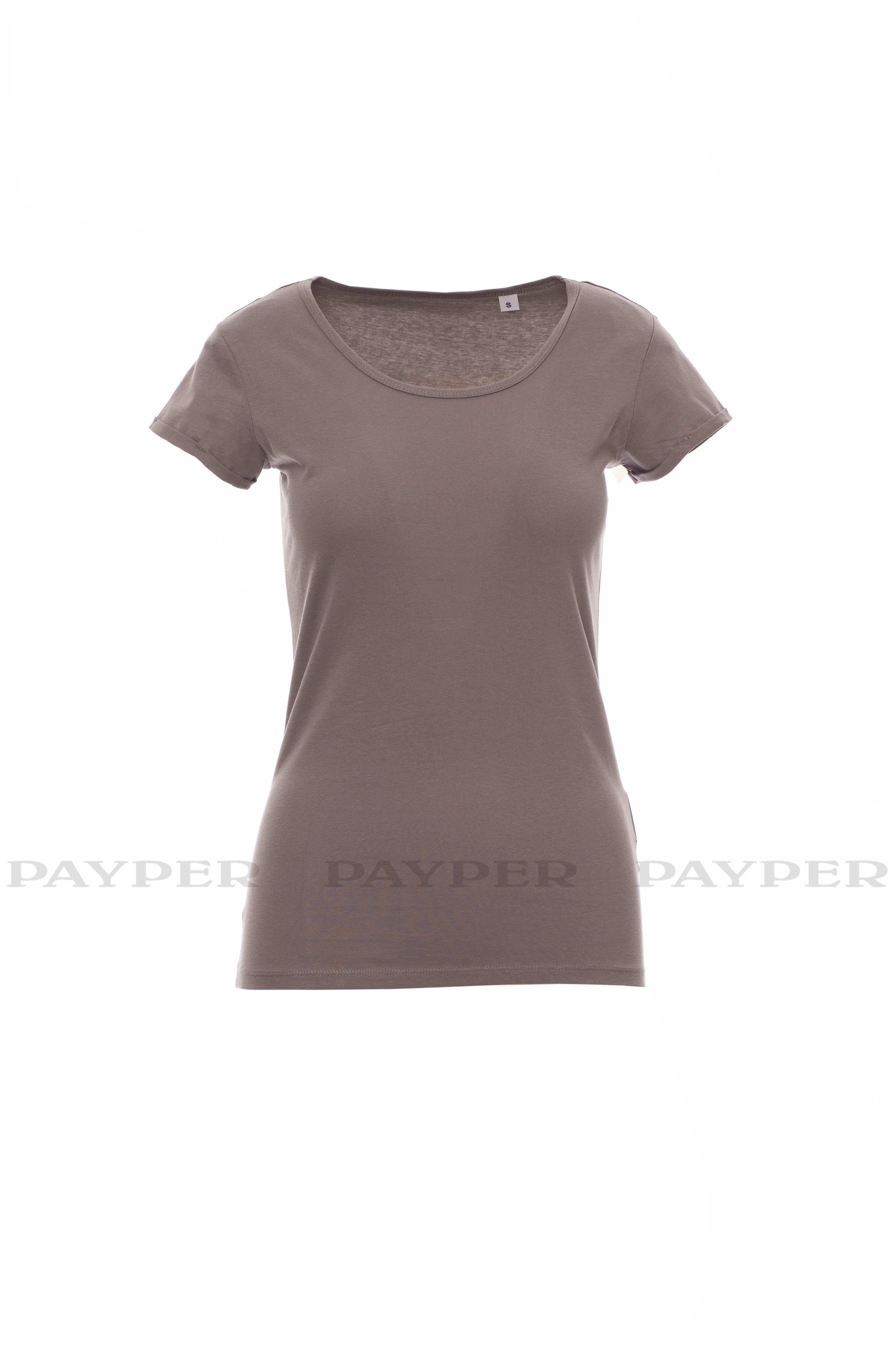 Dámské tričko s krátkým rukávem a krátkým výstřihem, s úzkým okrajem kolem krku, rukávy s úzkým surovým povrchem, boční švy. Bez štítku