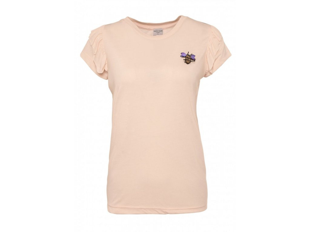 Tričko - dámské tričko s volánky, které na hrudi zdobí ozdoba s motivem včely vyrobené z korálků a flitrů, - vyrobeno z velmi příjemného a lehkého materiálu. Materiálové složení: 65% polyester, 35% viskóza