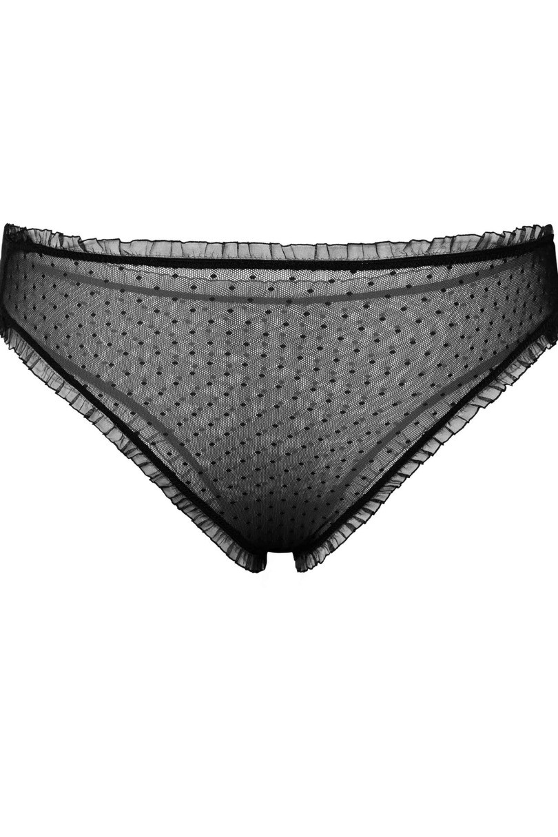 Klasické kalhotky z jemného černého centu. Je vyroben z tylové tkaniny a zakončen černým volánem.