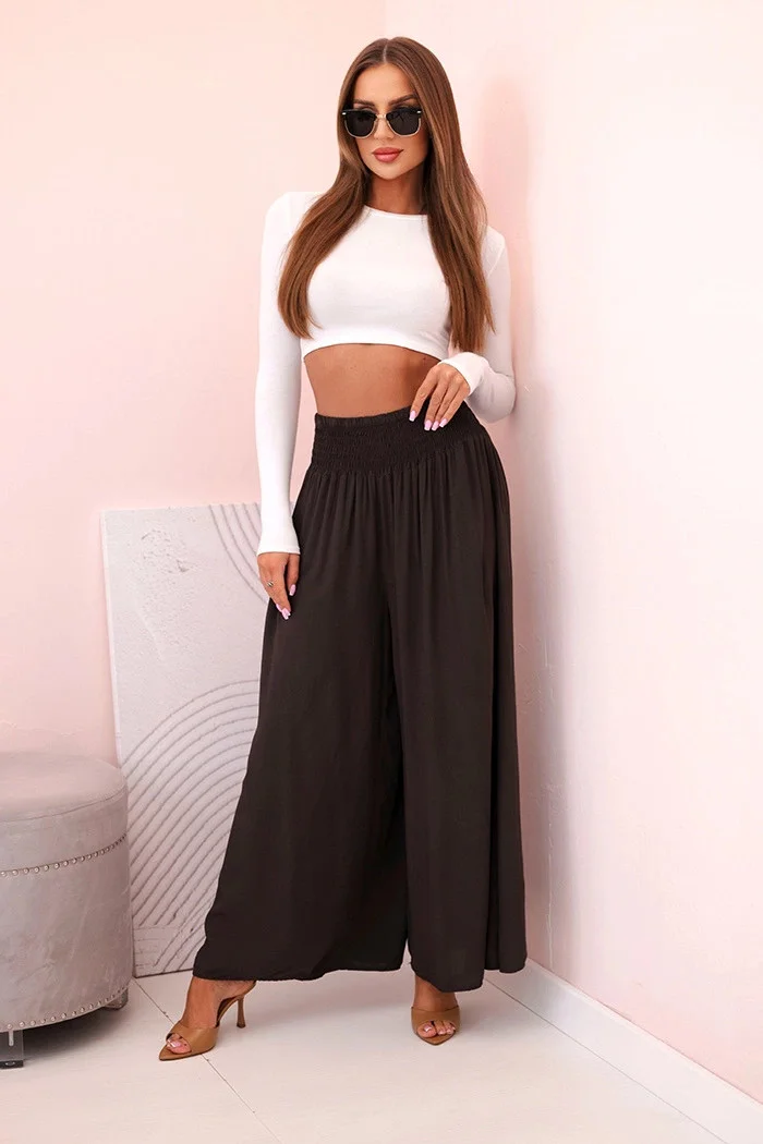Pokud hledáte pohodlné a stylové kalhoty na každý den nebo na dovolenou, tyto dámské palazzo kalhoty jsou trefou do černého! Vyrobené ze 100% lehké, vzdušné viskózy poskytují nejen komfort při nošení, ale také krásně padnou na postavu. Široké nohavice a rozšířený střih dodávají každému pohybu lehkost a eleganci a elastický pas se skvěle přizpůsobí pasu. Ideální na procházku, nákupy i na pláž – stačí přidat jednoduchý top a je to! Univerzální model, který by neměl chybět ve vašem šatníku. Velikost je univerzální a hodí se pro ženy velikosti S, M nebo L. Vlastnosti produktu: Střih: volné palazzo kalhoty Materiál: měkká, lehká viskóza Pohodlí: elastický pas, vzdušný materiál Funkčnost: snadno kombinovatelné, na různé příležitosti Další detaily: efektní řasení v pase Vyrobeno v Itálii Složení materiálu: 100% viskóza Rozměry uvedené níže jsou měřeny naplocho +/- 1 cm Pro získání obvodu vynásobte šířku dvěma Rozměry: Šířka v pase: 30 cm (po natažení: 50 cm) Šířka v bocích: 61 cm Celková délka: 95 cm Délka od rozkroku: 61 cm Šířka nohavice: 42 cm
